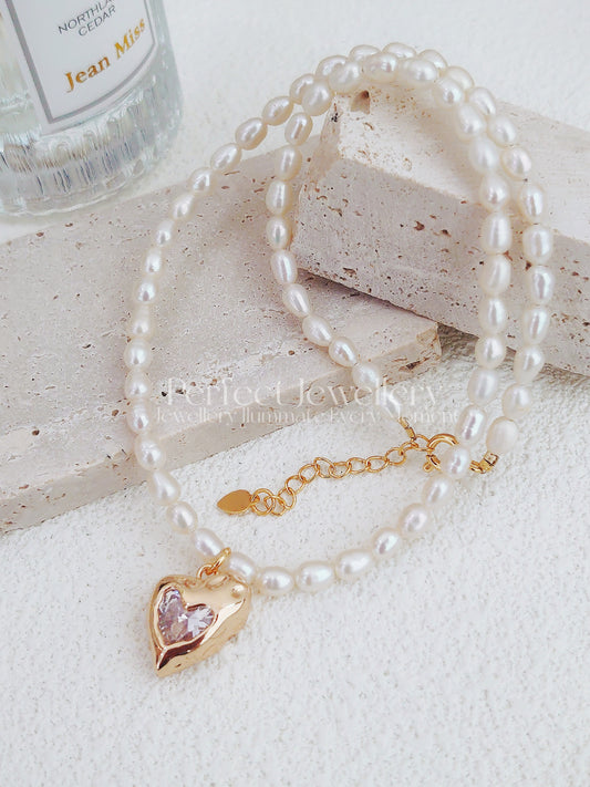 Heart Pendant Freshwater Pearl Necklace | 不對稱愛心米珠項鏈